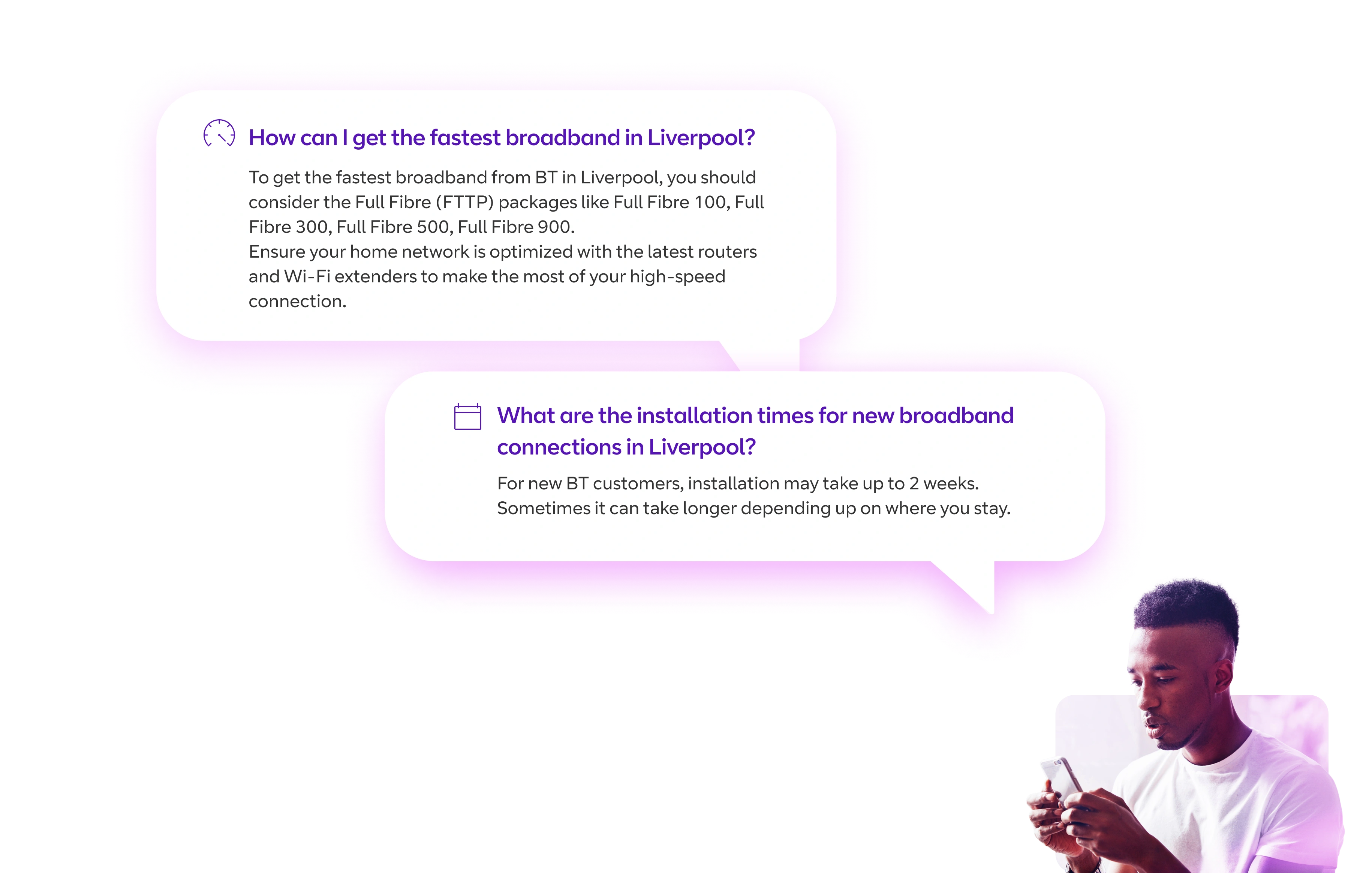 Most localities in Liverpool provide Full Fibre internet and the average internet speed in Liverpool is around 245Mbps.