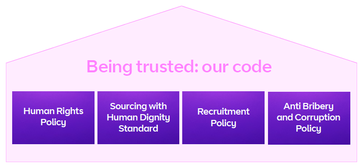 We only work with people who choose to work freely. We respect the right to equal opportunity, freedom of association and collective bargaining. This is set out in our Modern Slavery Statements, Being trusted: our code and human rights policy. We also live it every day through our supplier standard on working conditions, Sourcing with Human Dignity.