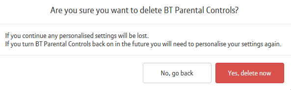 We don't recommend deleting your BT Parental Controls completely as you'll lose all your settings. It's easier to turn them off temporarily, and if you decide you want them back, you can just flick them back on.